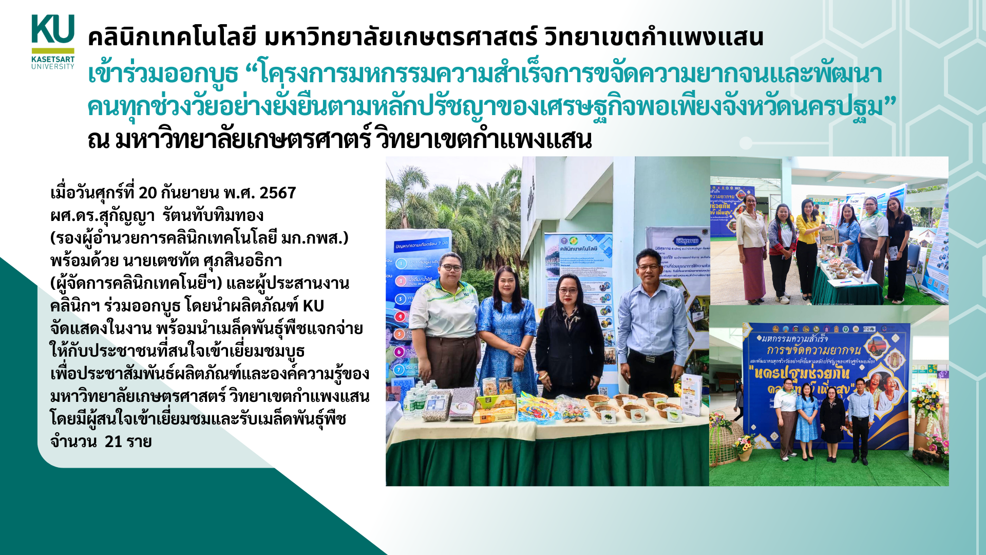 คลินิคเทคโนโลยี มหาวิทยาลัยเกษตรศาสตร์ วิทยาเขตกำแพงแสน เข้าร่วมออกบูธ “โครงการมหกรรมความสำเร็จการขจัดความยากจนและพัฒนาคนทุกช่วงวัยอย่างยั่งยืนตามหลักปรัชญาของเศรษฐกิจพอเพียงจังหวัดนครปฐม” Continue reading