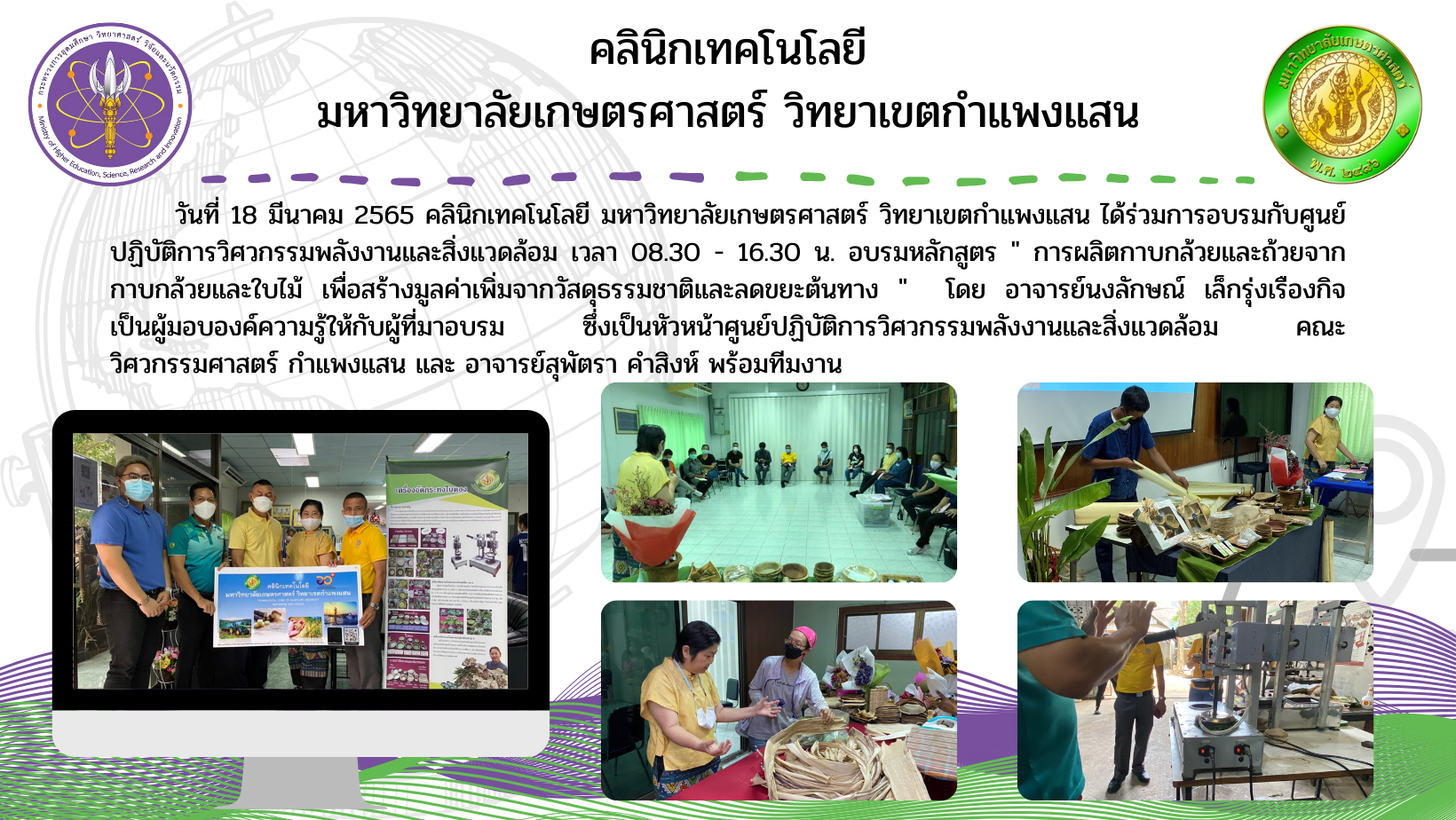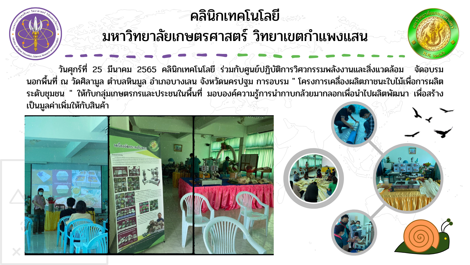คลินิกเทคโนโลยี มหาวิทยาลัยเกษตรศาสตร์ วิทยาเขตกำแพงแสน จัดการอบรม การลอกกาบกล้วยเพื่อมาทำเป็นภาชนะใส่อาหาร ให้กับกลุ่มเกษตรกร ณ โรงเรียนวัดศิลามูล Continue reading
